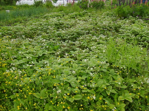 На участке есть деревья, яблони молодые, груши, сливы, смородина, малина, крыжовник, черноплодная рябина, облепиха. Забор везде — сетка рабица.